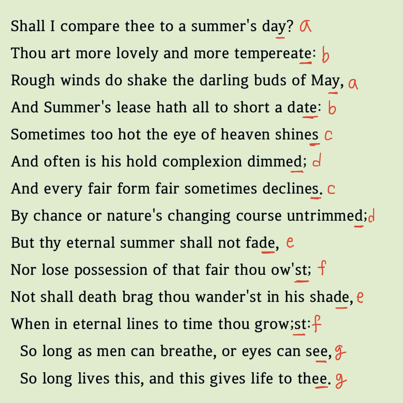 셰익스피어 소네트의 압운 체계는 이탈리아 소네트와는 달리 abab cdcd efef gg의 압운체계를 가지고 있습니다. 이는 시에서 다음과 같이 나타납니다.