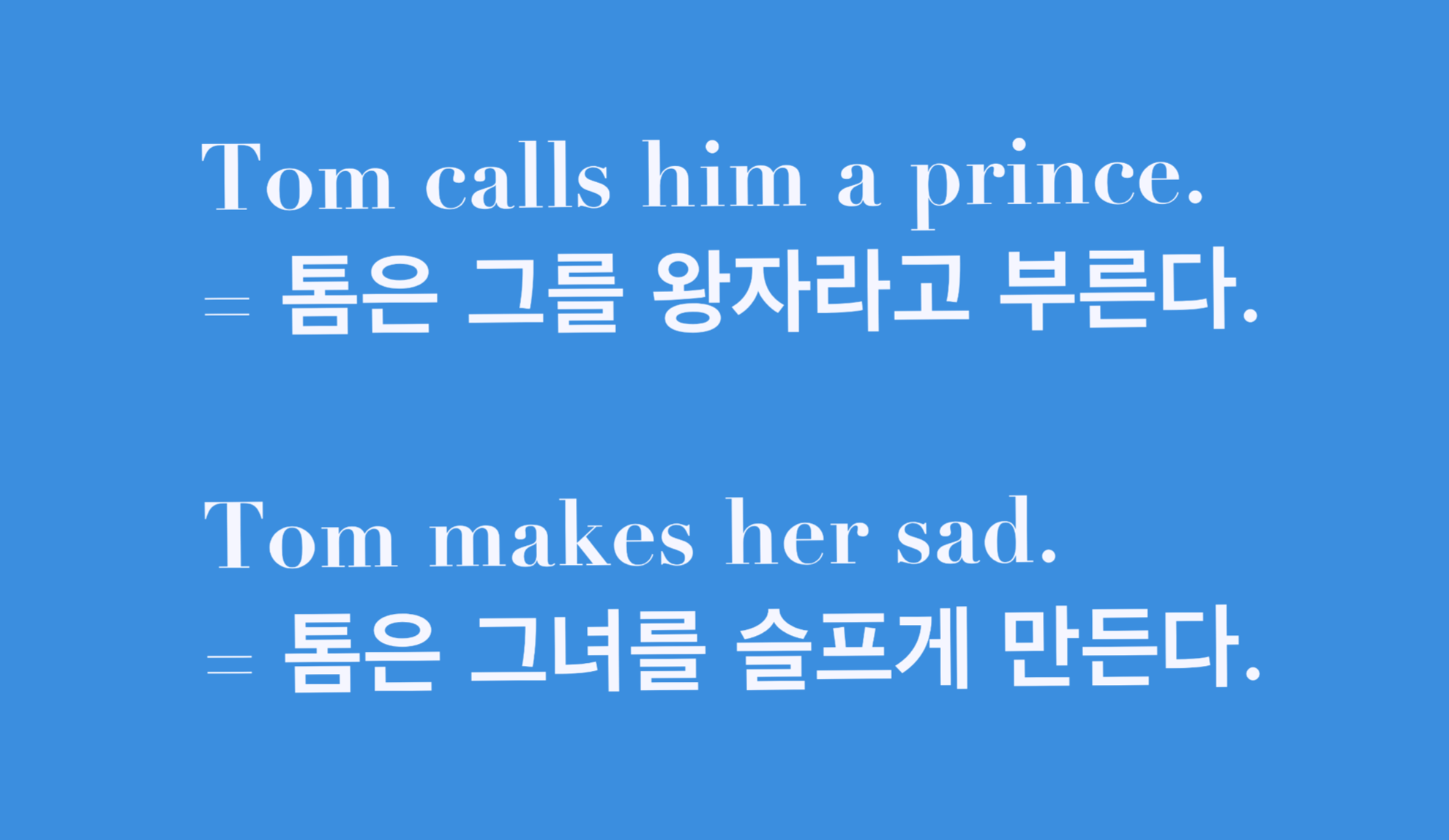 그래서 'Tom makes her sadly'는 완전 틀린 문장이 됩니다.(부사가 '-하게'로 해석되고 앞의 예문도 '슬프게'로 해석되지만 절대 부사는 목적격 보어에 위치할 수 없습니다! )