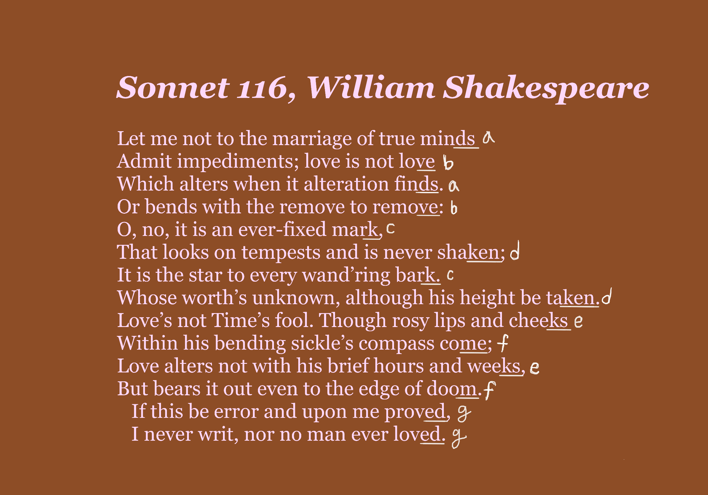 소네트 116은 ababcdcdfefgg의 각운을 가집니다.