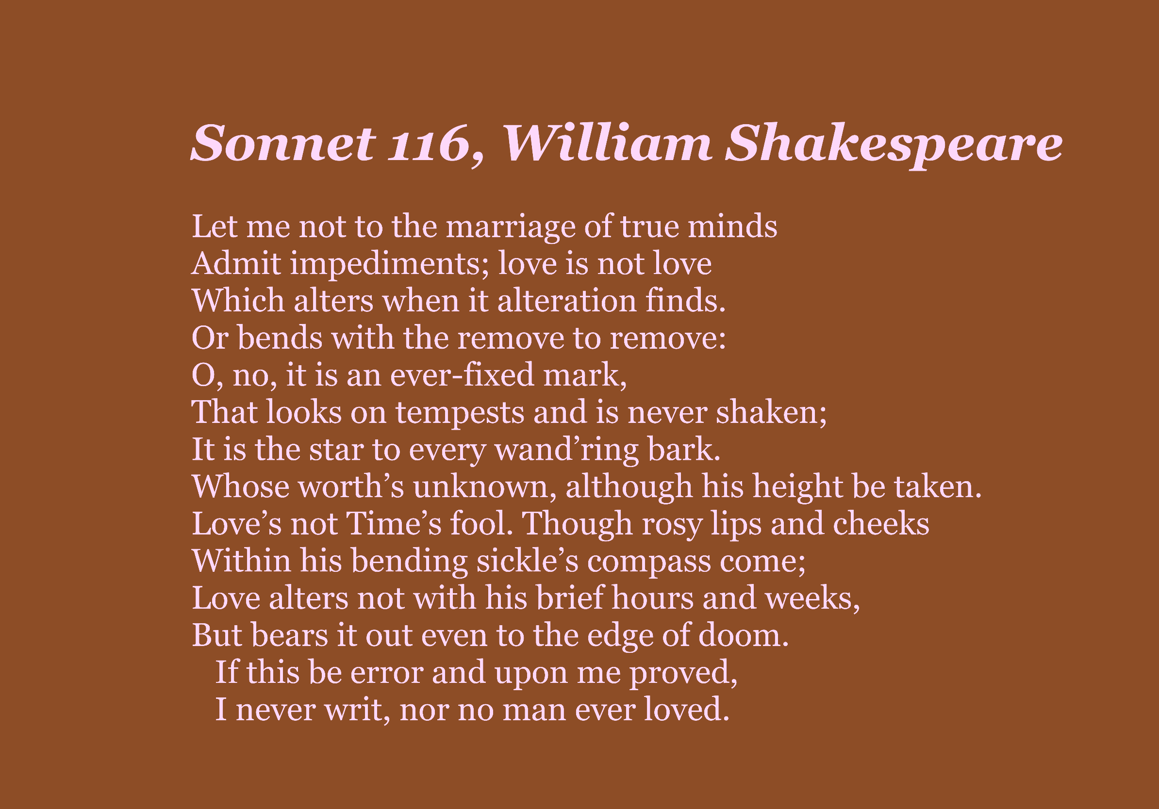 셰익스피어의 소네트 116은 사랑의 불변성을 노래합니다. 시인은 변하지 않는 것이 이상적인 사랑이며 사랑의 속성이라 말합니다.