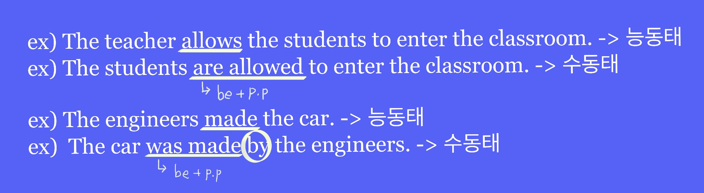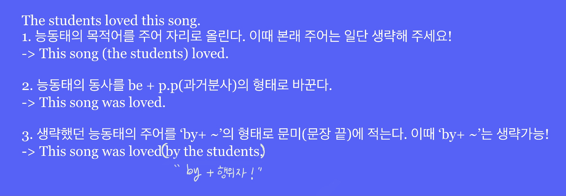 이상으로 수동태의 기본적인 내용들을 살펴보았습니다.