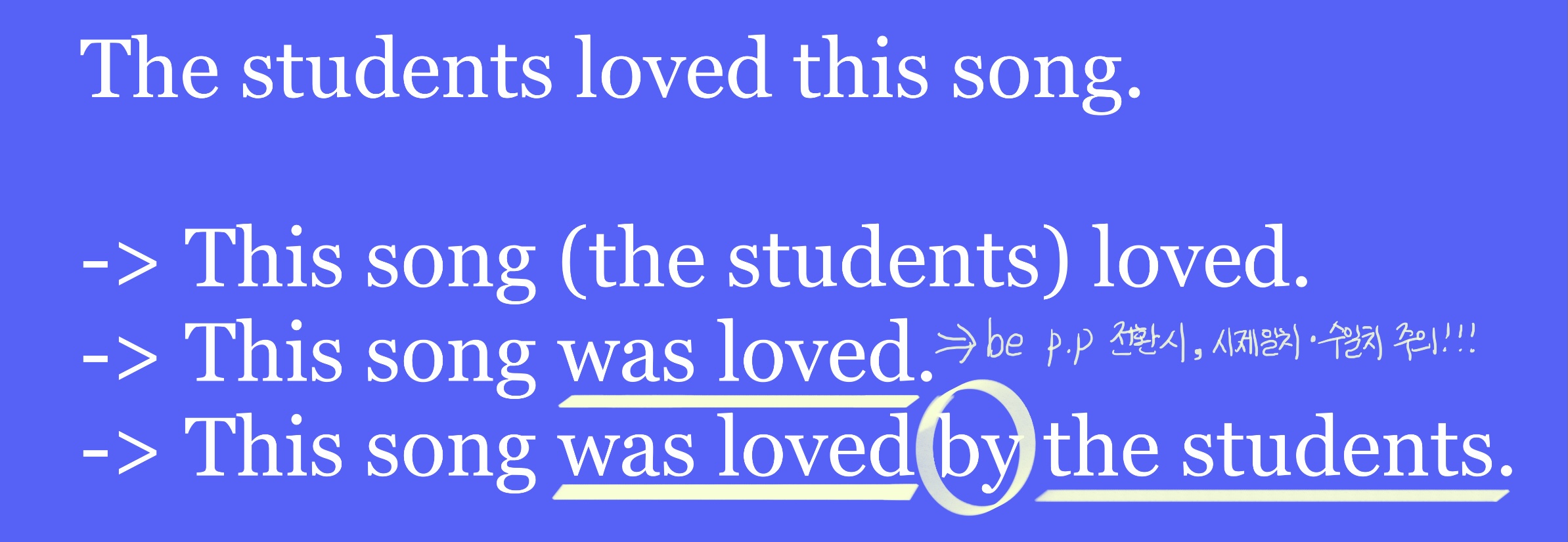 이때, 동사를 be + p.p로 전환하는 과정에서 동사의 수일치와, 시제 일치를 반드시 해주어야 한다는 것 잊지 마세요!!! 위 문장은 과거형이니 be동사의 과거형으로, 수동태 전환 후 주어는 this song이니 단수로 수일치를 해주어야겠죠??