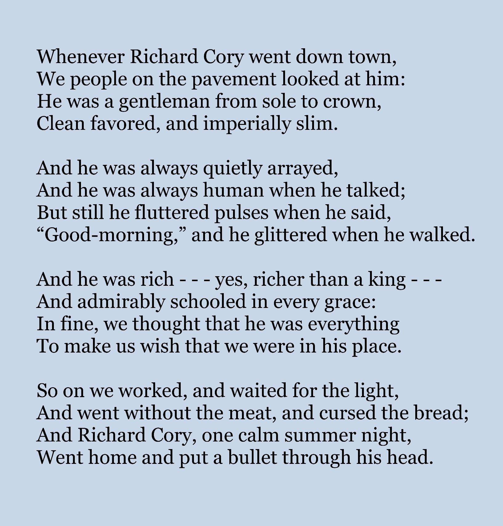 "길 위의 사람들"은 언젠가 자신들을 비출 "light"(빛)을 기다리며 살아갑니다. 그러나, 마지막 두 행은 놀라운 아이러니를 보여줍니다. 잘생긴 외모, 재력, 집안, 인성, 학력 등 모든 것을 갖춘 것으로 보였던 리처드 코리는 자신의 삶을 스스로 포기합니다. 그가 가진 모든 것은 그의 행복을 보장해주지 않았고 오히려 그는 스스로 목숨을 끊을 정도로 우울하고 좌절했던 것입니다.