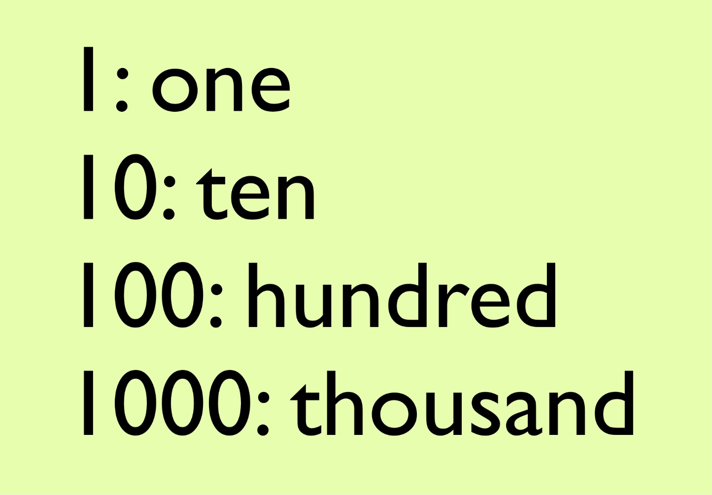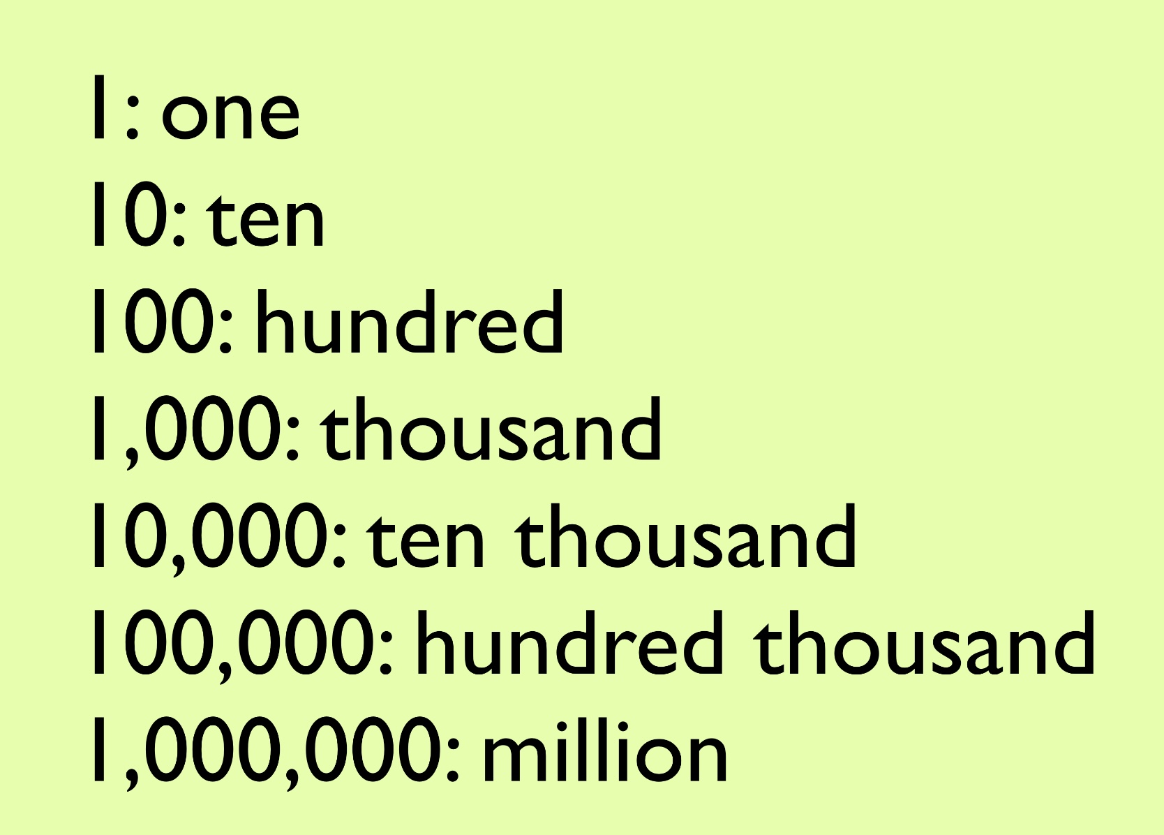 Ex) thousand(1,000) -> ten thousand(10,000) -> hundred thousand(100,000) -> million(1,000,000)