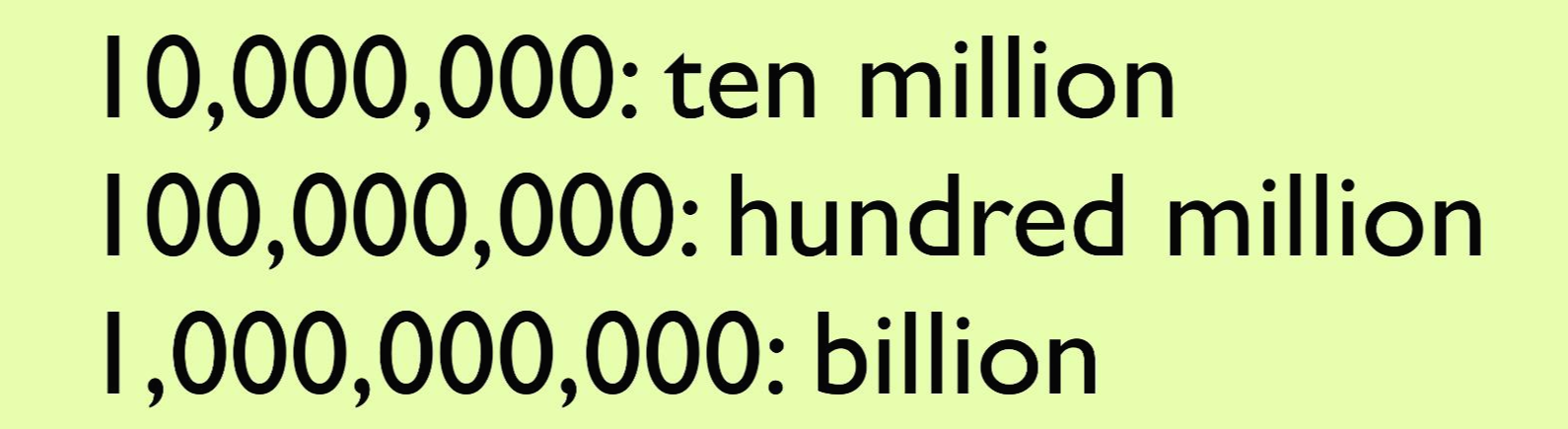 그렇다면 1,000,000은 어떻게 표헌할까요? 이는 1,000에 1,000 곱한 thousand thousand가 아닌 million이 됩니다!