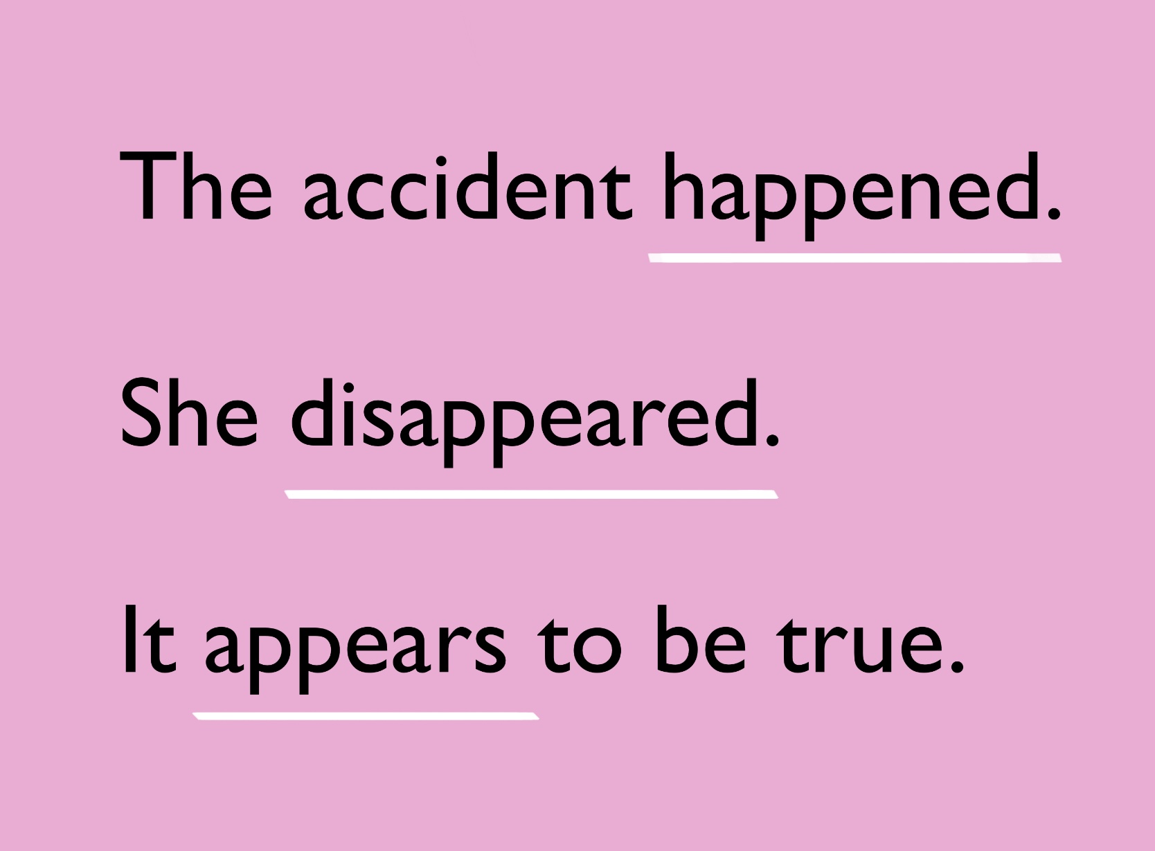 예문의 happen, disappear, appear은 모두 목적어를 갖지 않는 자동사입니다. 목적어가 있는 동사만 수동태 대응을 가질 수 있으니 자연스럽게 자동사는 수동태가 불가합니다. 수동태 주어로 올려줄 목적어가 아예 존재하지 않는 것이죠!