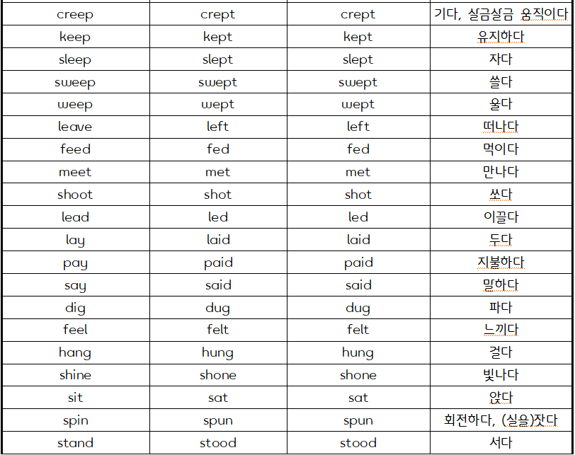 creep-crept-crept keep-kept-kept sleep-slept-slept sweep-swept-swept