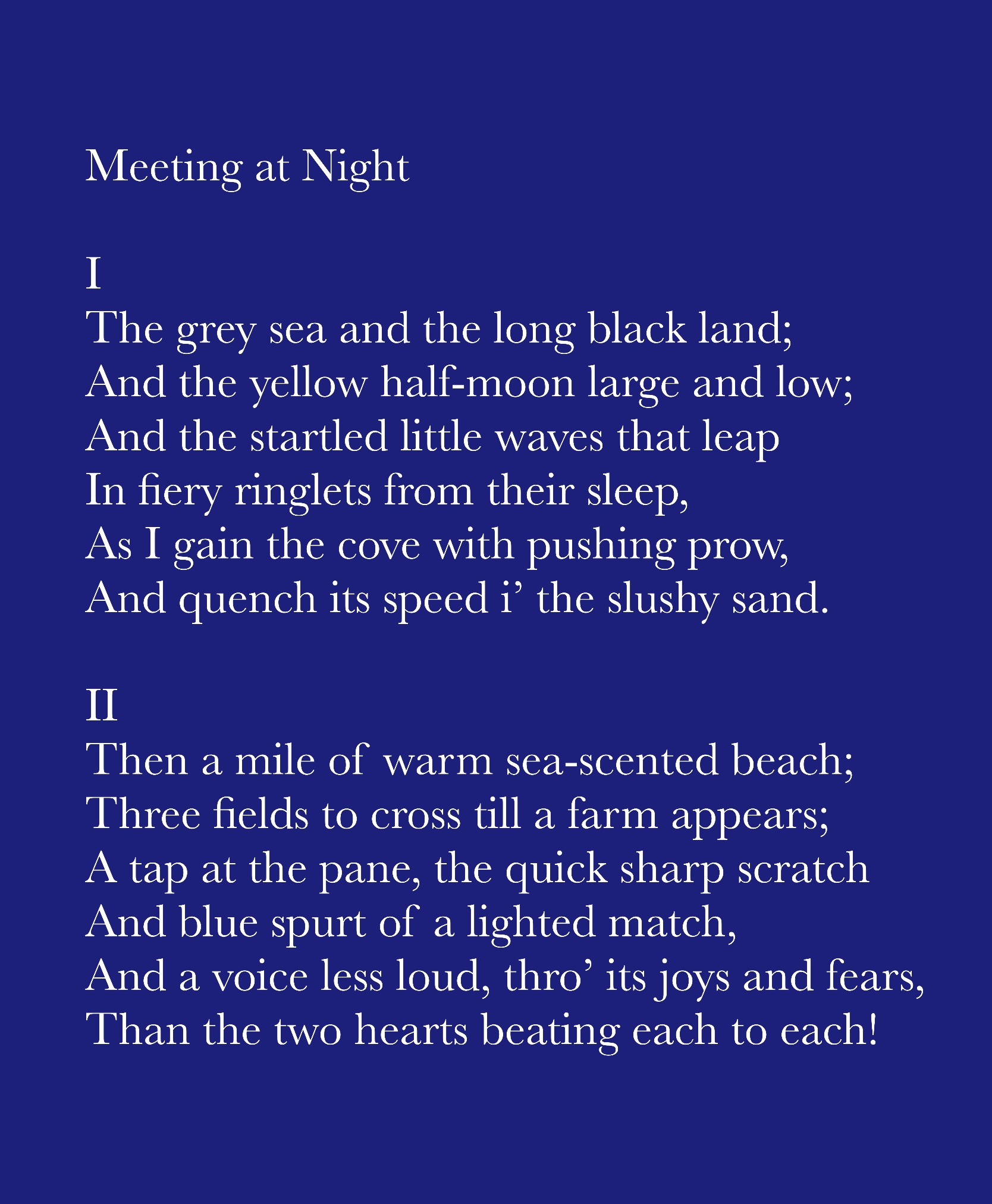 <밤의 밀회>(Meeting at Night)은 1845년 경 로버트 브라우닝이 자신의 연인 엘리자베스 배럿과 사랑에 빠진 후 쓴 시입니다. 배럿의 아버지는 그들의 사랑을 강력히 반대했지만, 그들은 감시를 피해 밀회를 이어나갔다고 전해집니다.