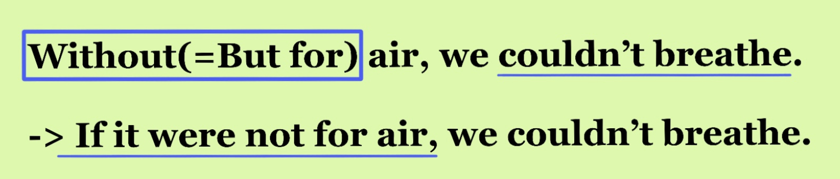 Without을 사용해 '~가 없다면'의 의미를 나타낼 수 있으니, '공기가 없다면, 우리는 숨실 수 없다'라고 해석하면 되겠죠? 콤마 뒤 주절 파트에 '조동사 과거+동사원형'이 사용된 것까지 확인할 수 있습니다. Without은 but for로 대체할 수 있답니다!