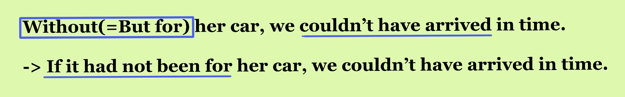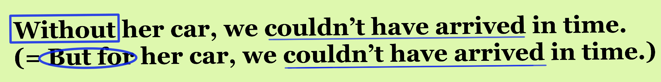 2) Without(=But for) her car, we couldn't have arrived in time.