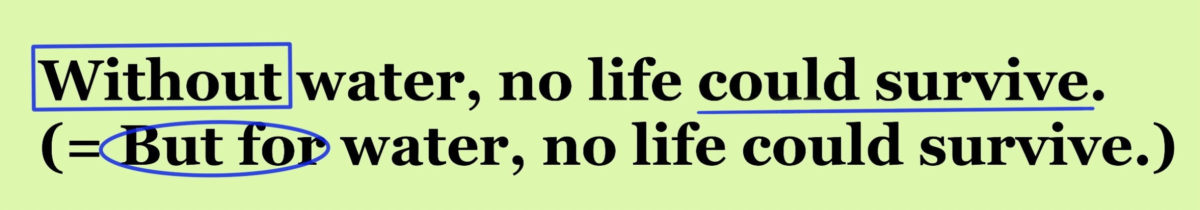 2) Without water, no life could survive. (=But for water, no life could survive.)
