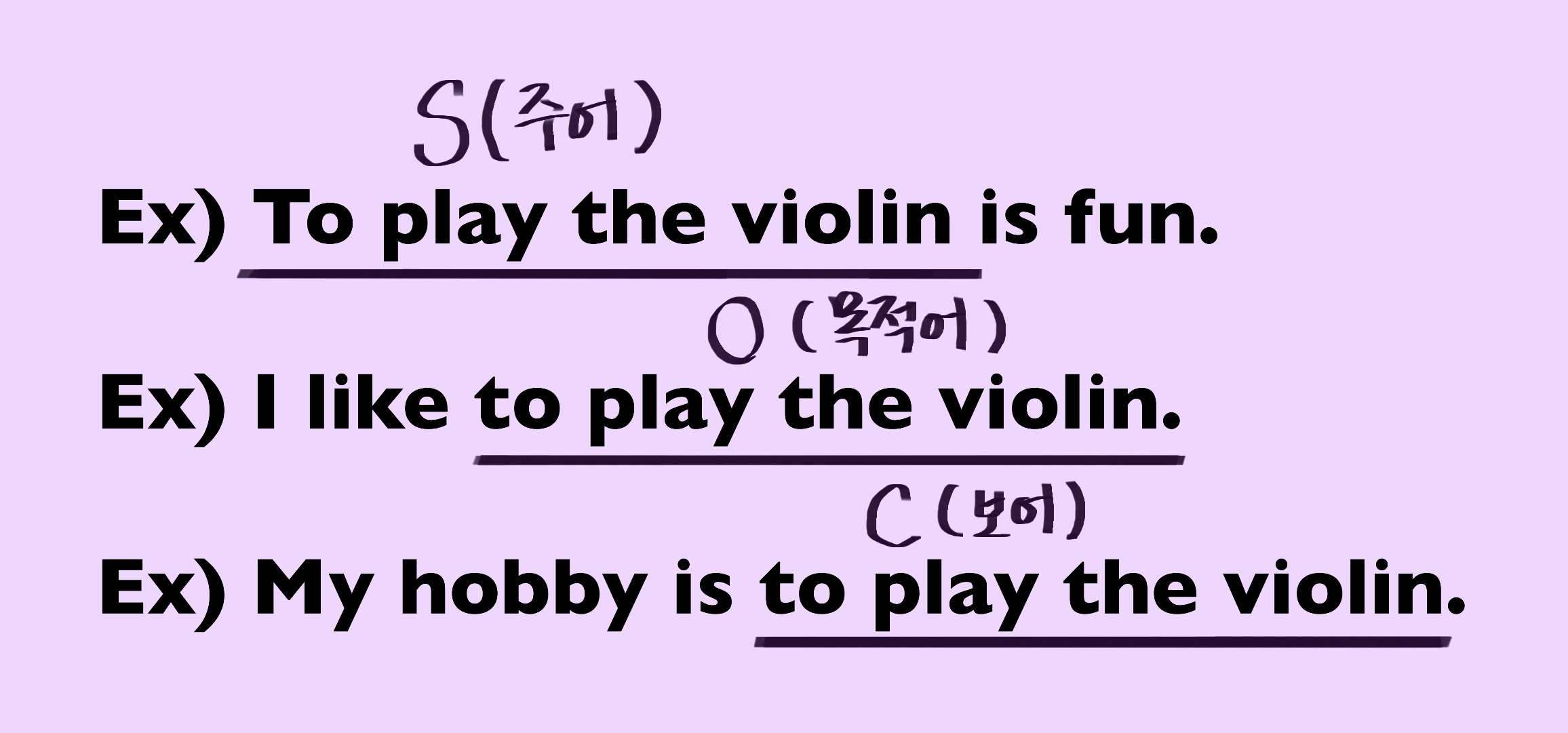 3) My hobby is to play the violin. = 내 취미는 바이올린 연주하는 것이다.