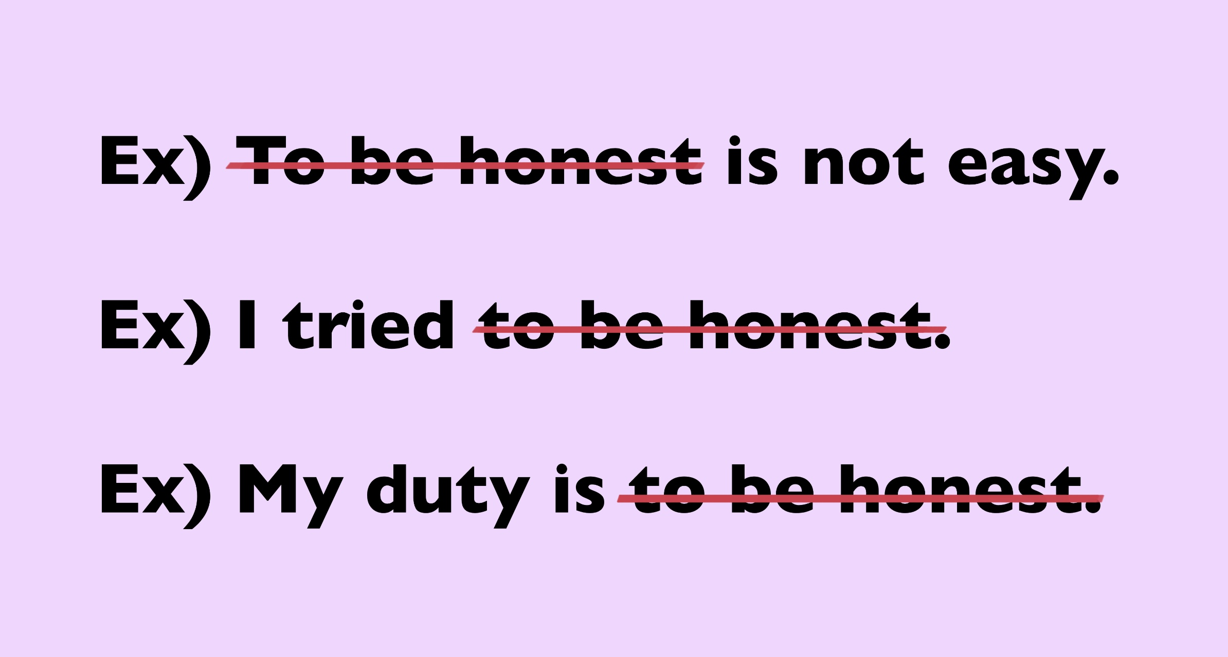 1) To be honest is not easy. = 정직한 것은 쉽지 않다.