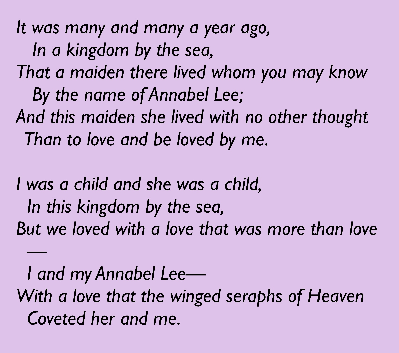 시인 에드거 앨런 포는 <애너벨 리>(Annabel Lee)에서 아름다운 연인의 이른 죽음으로 인해 부서진 사랑을 노래하고 있습니다. 시가 후반부로 나아갈수록 화자의 슬픔이 더욱 강렬하게 전달되며 크기를 더해갑니다. 사랑보다 더 큰 사랑을 했다고 감히 말하는 화자의 영혼은, 그에 따르면, 영원히 애너벨 리와 연결되어 있습니다.