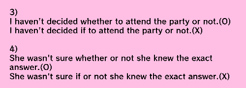 다만 문장 끝에 or not을 붙이는 경우는 if와 whether 둘 다 가능하답니다.