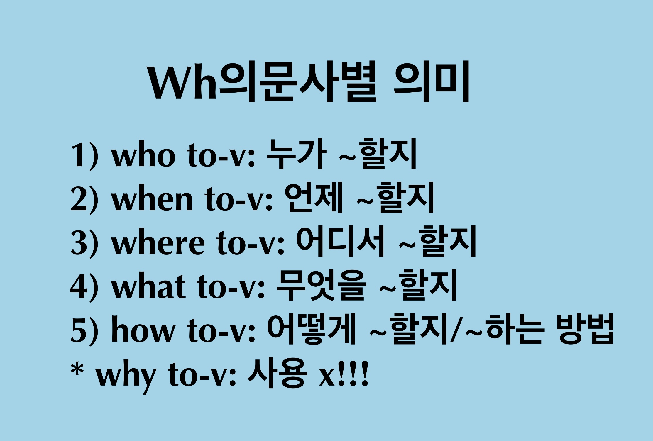 *주의사항) wh의문사 중 'why'는 뒤에 to-v를 쓰지 않습니다! Why 다음에는 절(문장의 형식)만 나올 수 있다는 것에 주의해 주세요.