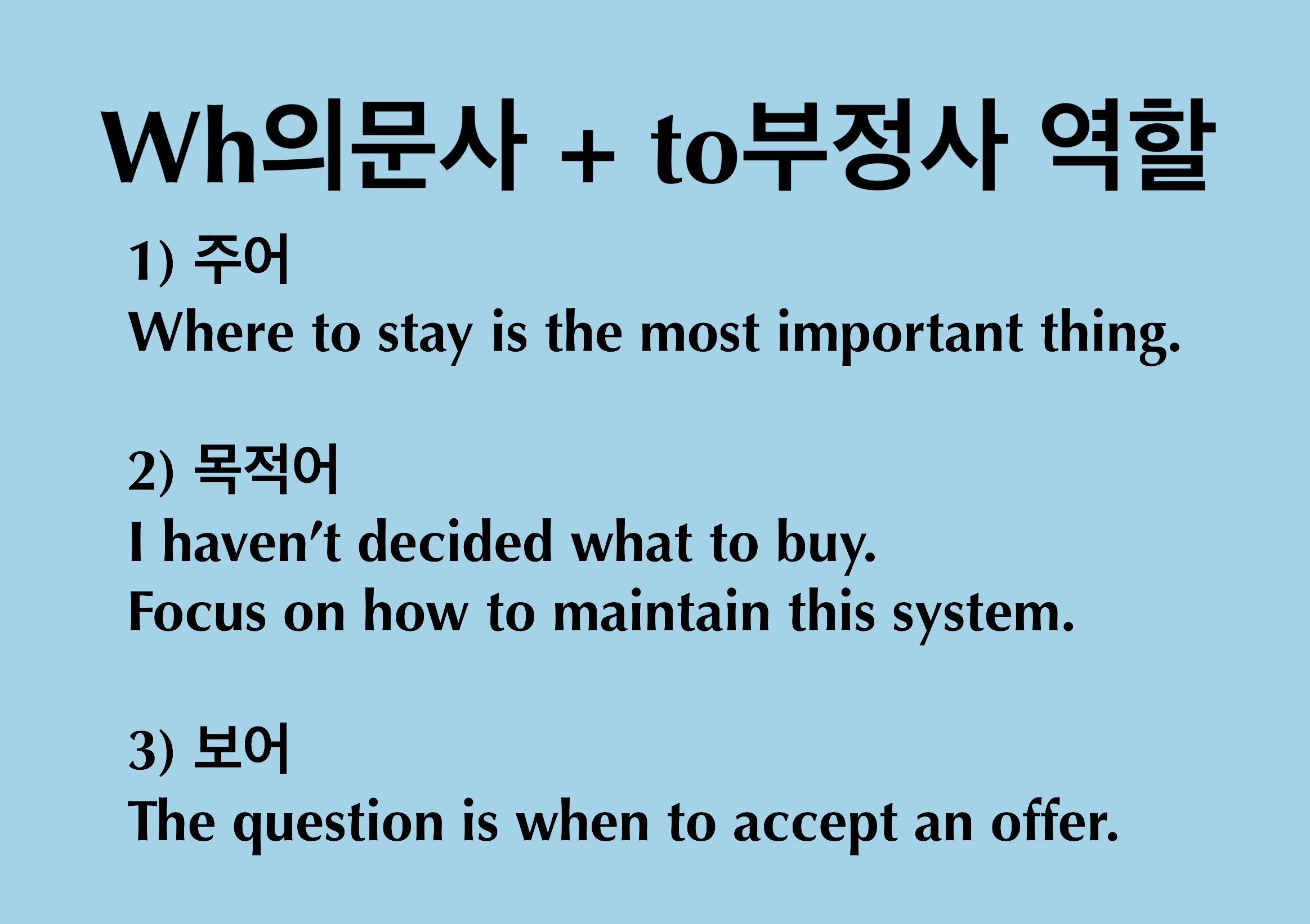(문장 속에서 명사는 주어, 목적어, 보어의 기능을 가진답니다. 따라서. 의문사 to부정사 또한 다른 명사구들과 마찬가지로 주어, 목적어, 보어로 기능할 수 있습니다.)