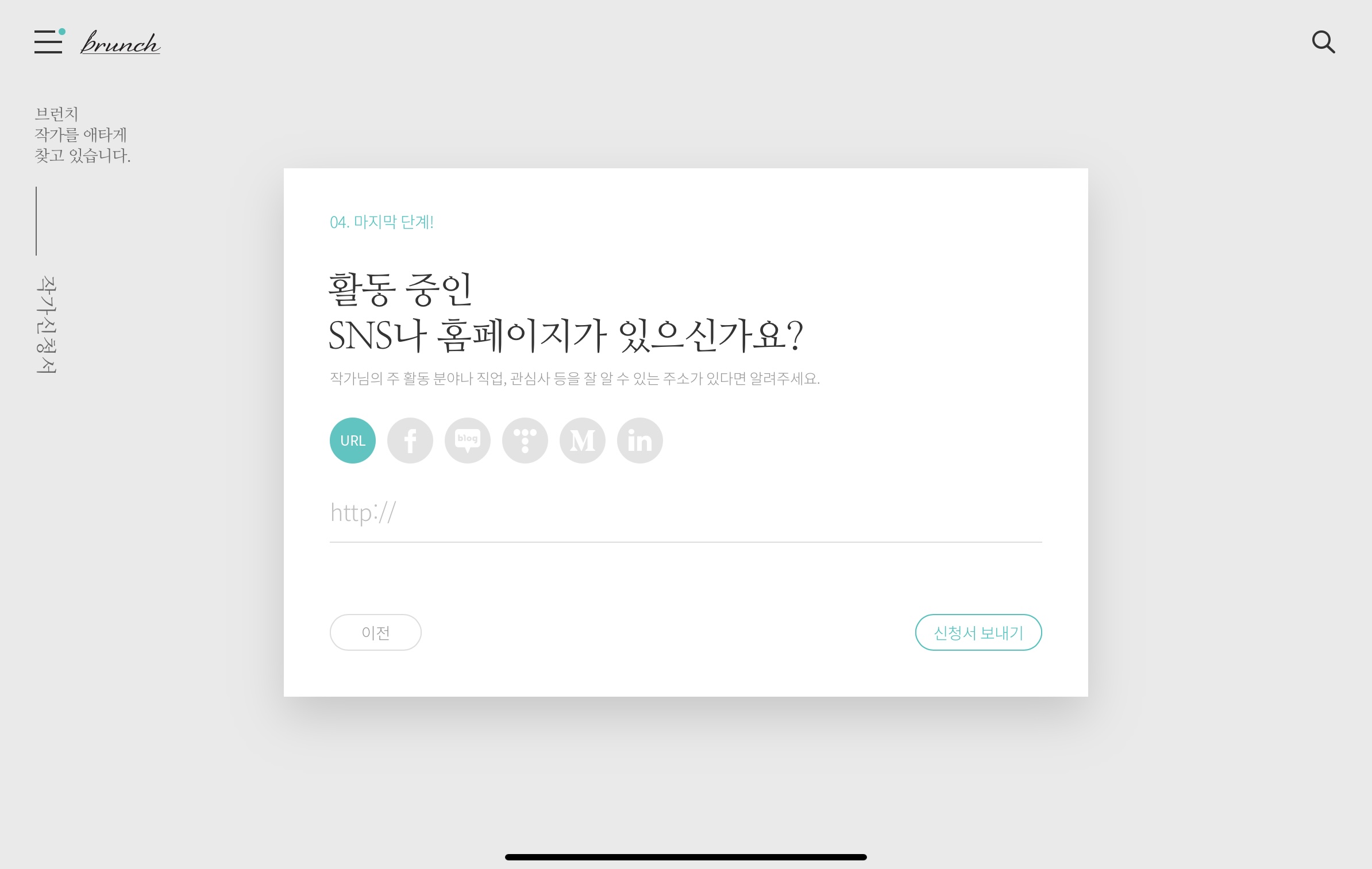 이 화면이 뜨면 이제 브런치 작가 신청을 위한 본격적인 과정이 시작됩니다.